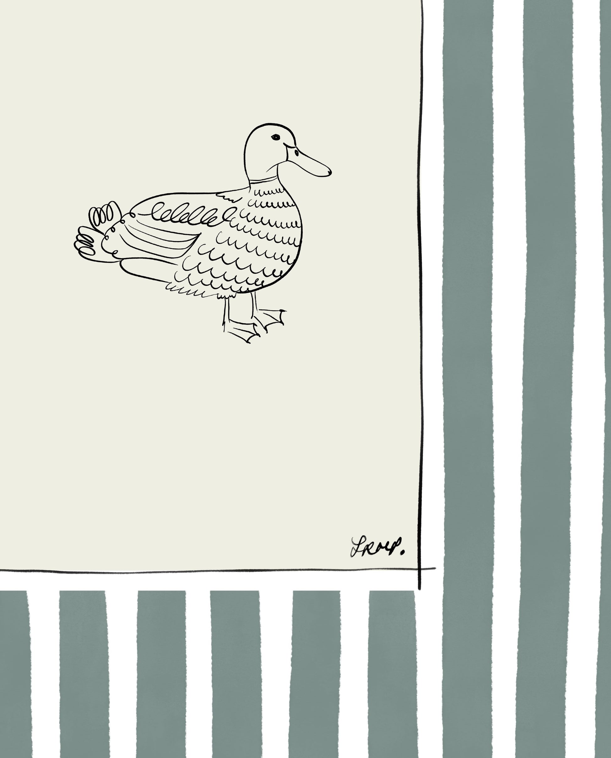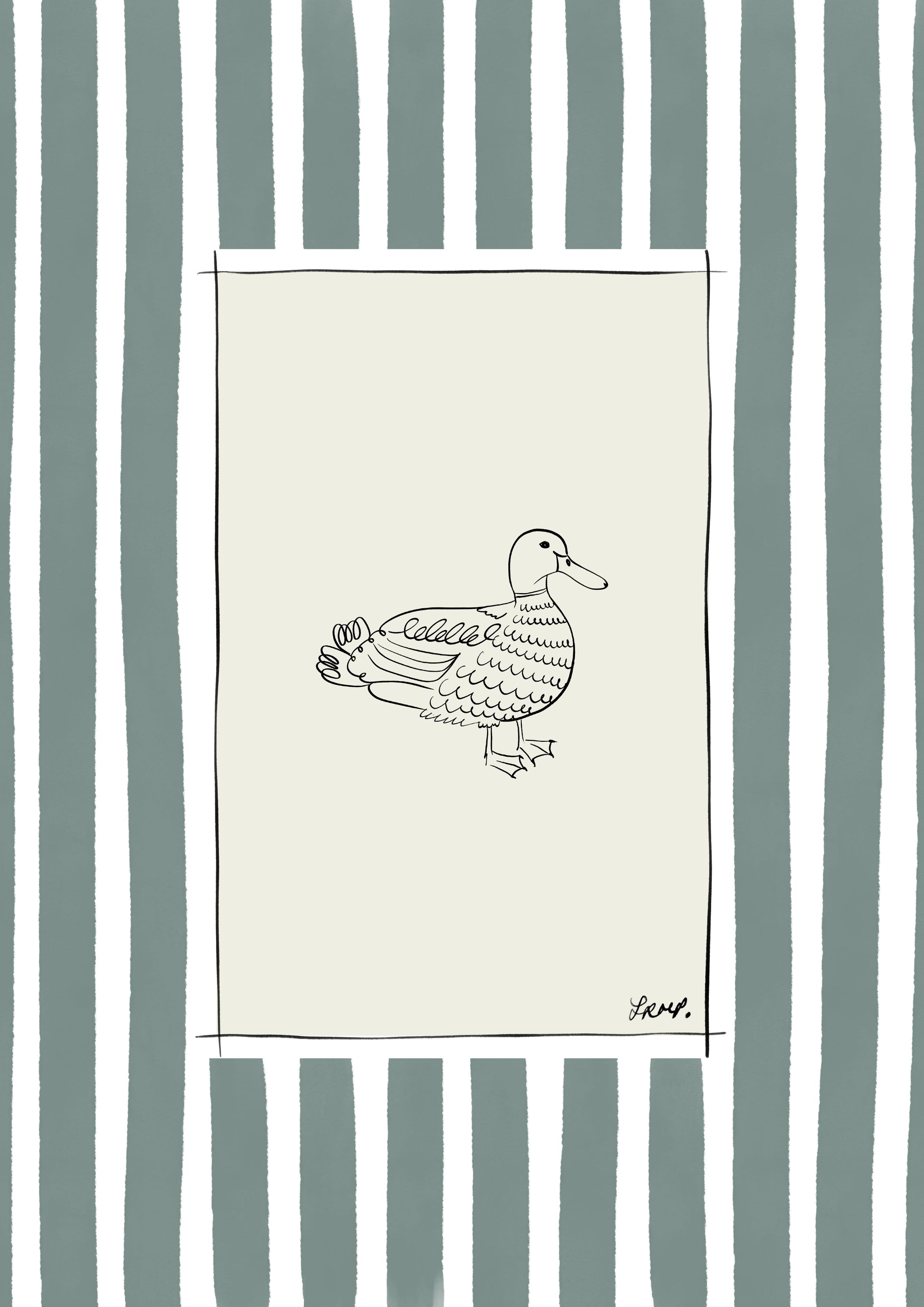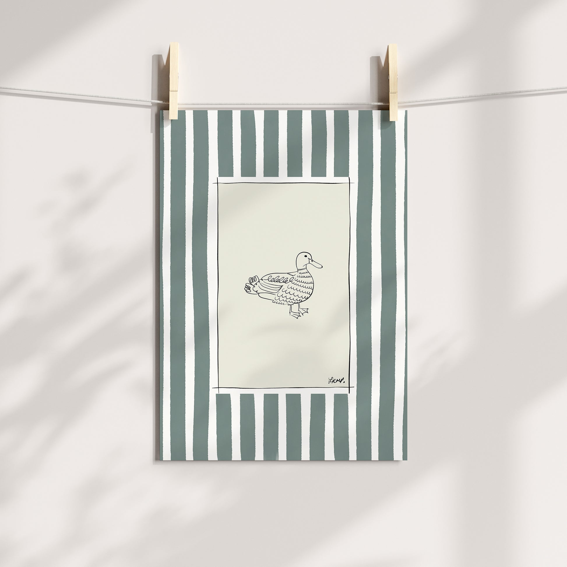 Lovely artful art print of a Duck (hand-drawn by me) with a dirty green watercolour striped surround. An artful birthday gift or for someone moving to a new home, a bedroom, a bathroom - or just any corner needing some colour.