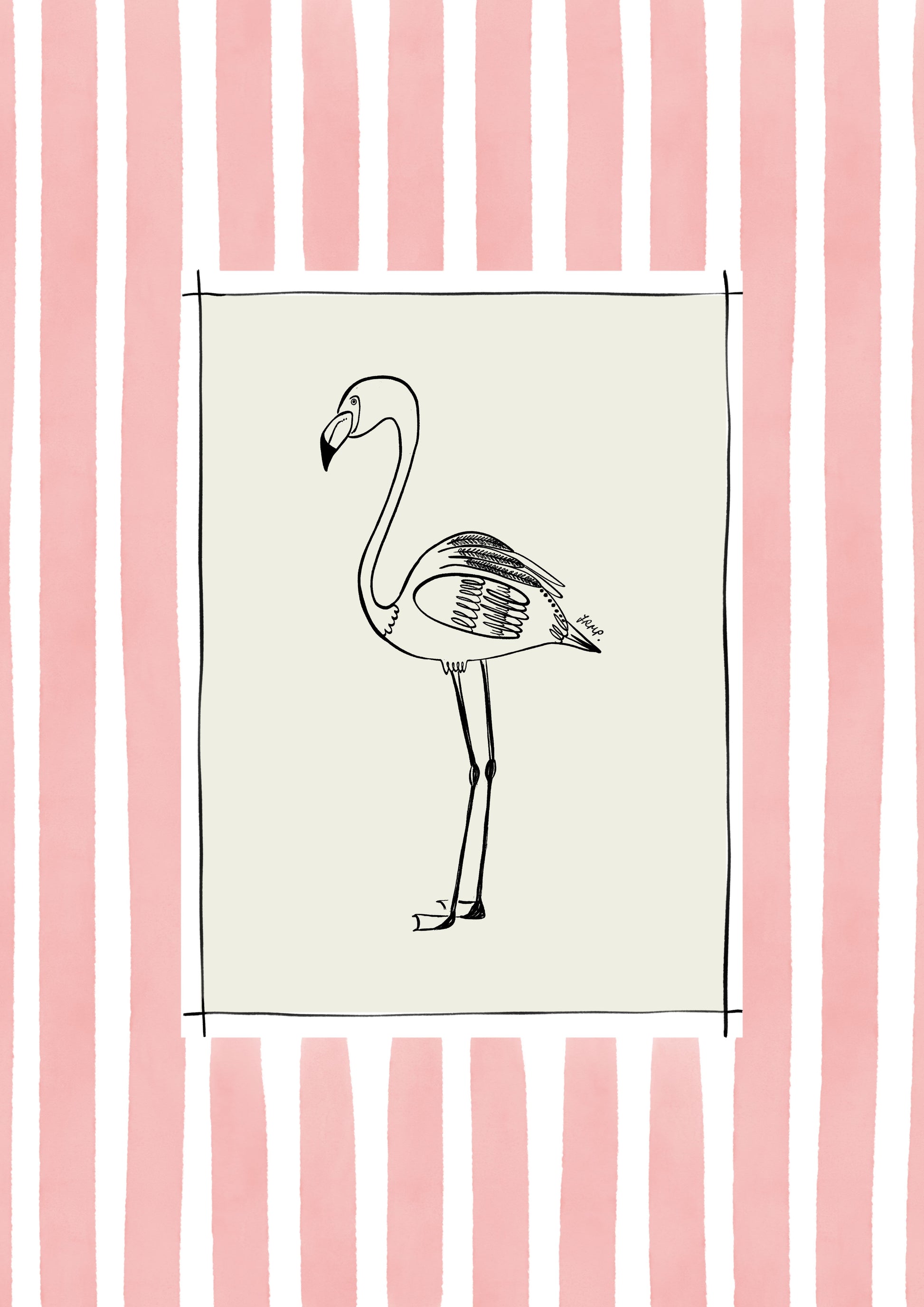 Lovely artful art print of a Flamingo (hand-drawn by me) with a pink watercolour striped surround. An artful birthday gift or for someone moving to a new home, a bedroom, a bathroom - or just any corner needing some colour.