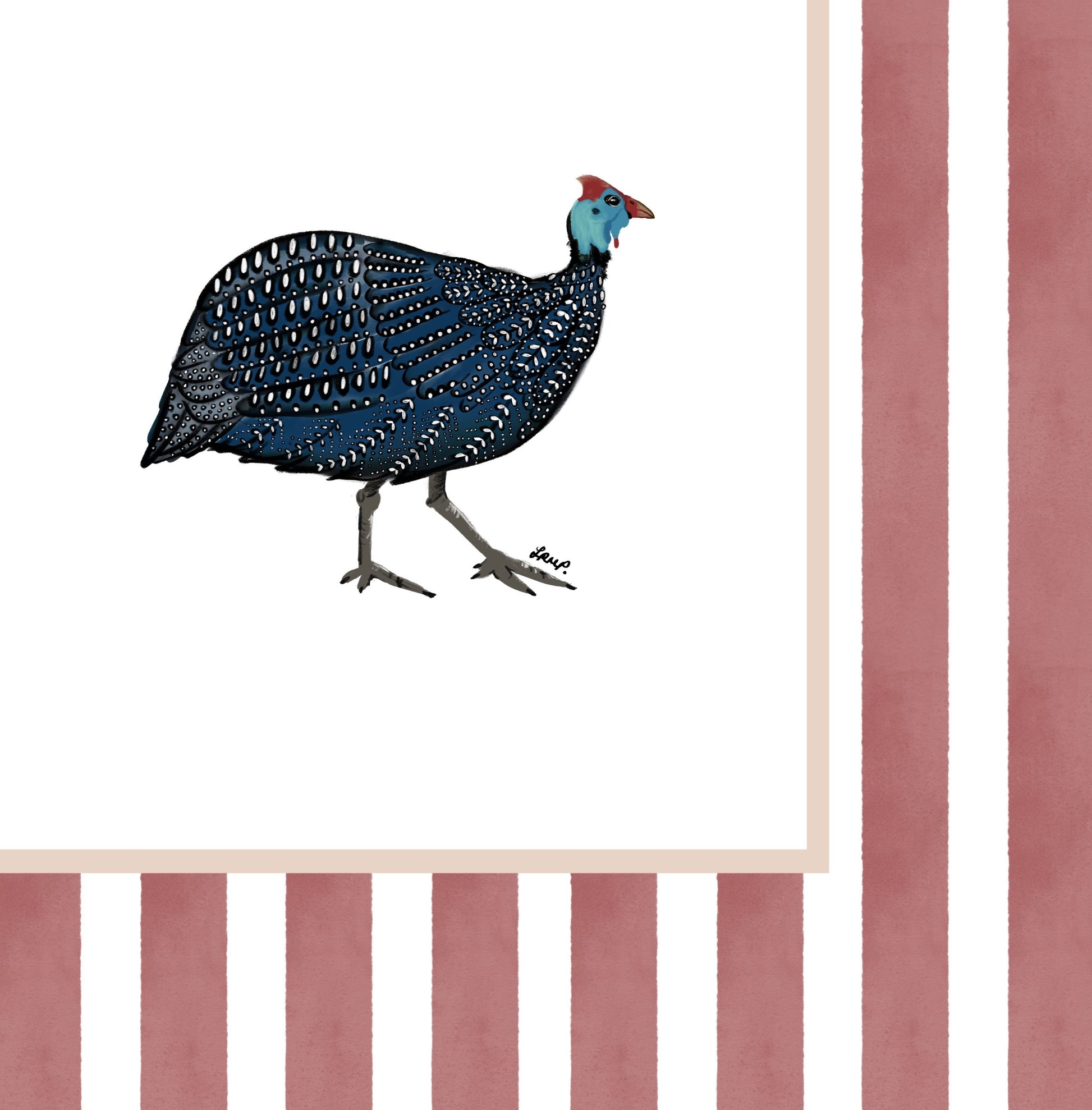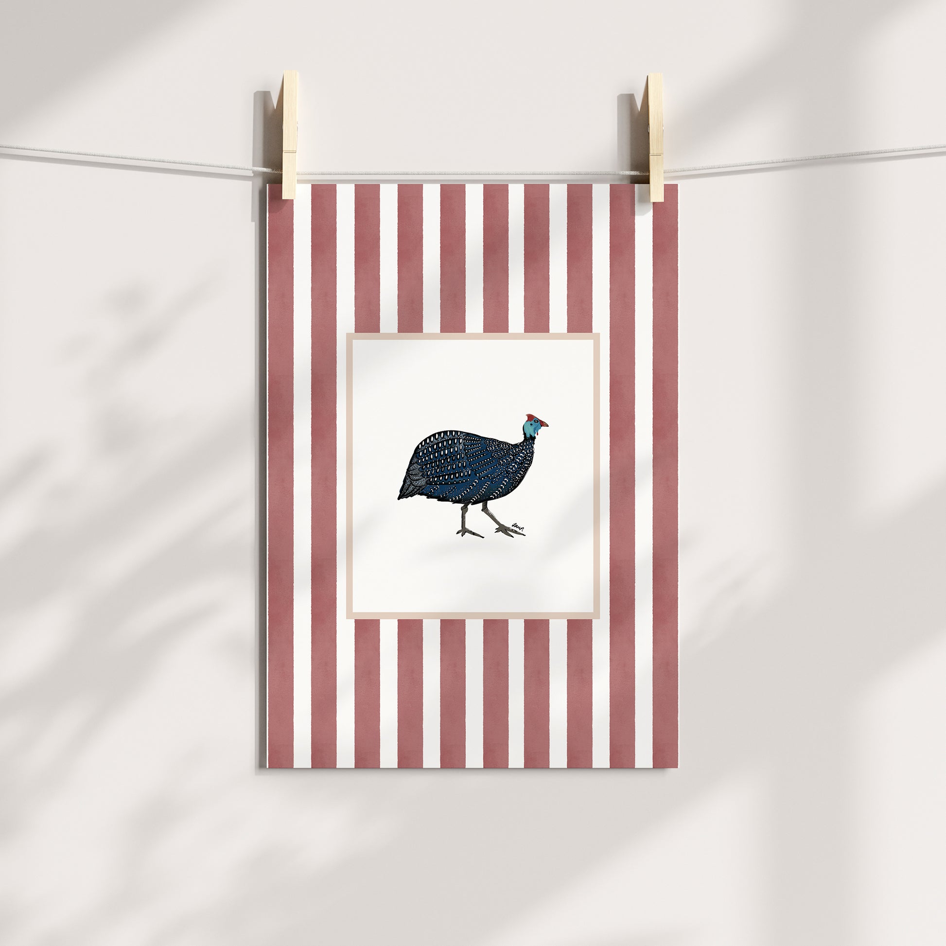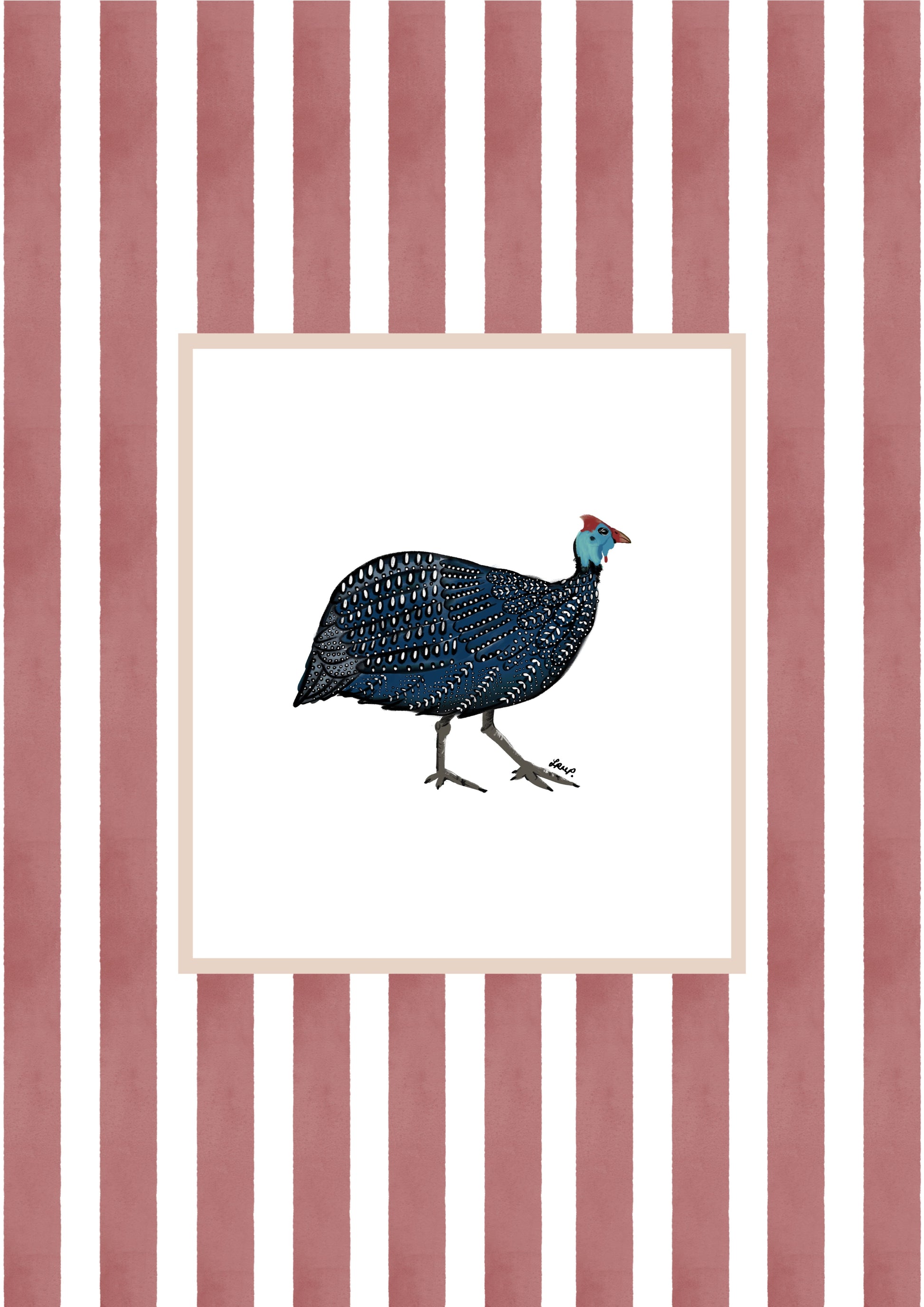 Lovely artful colour art print of a Guinea Fowl (hand-drawn by me) with a soft terracotta watercolour striped surround. An artful birthday gift or for someone moving to a new home, a bedroom, a bathroom - or just any corner needing some colour.