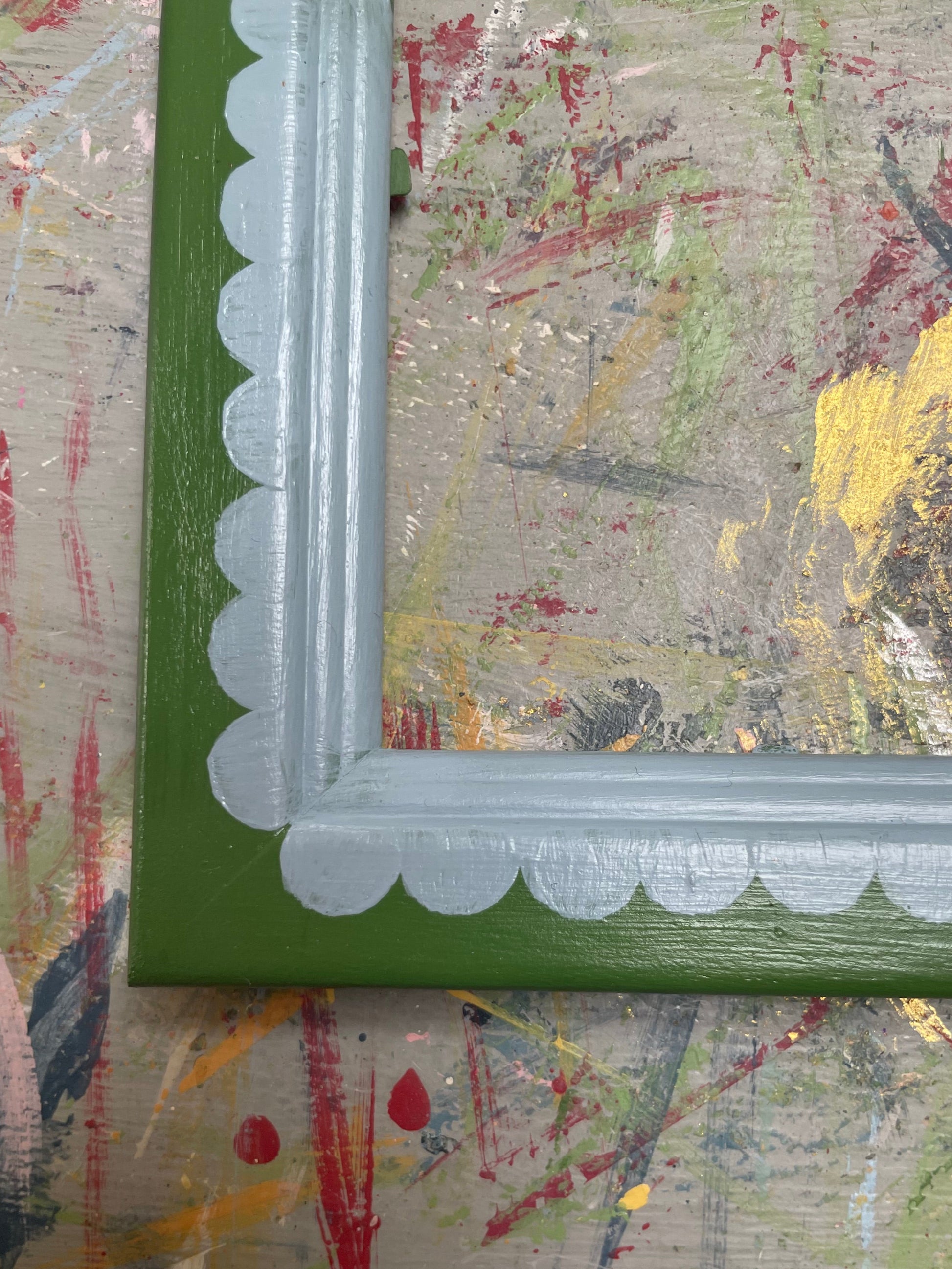Liven up any space with this hand-painted scalloped frame in French Blue and Hopper . Perfect for showcasing your favourite photo, print, or artwork while adding a touch of modern whimsy to your home.