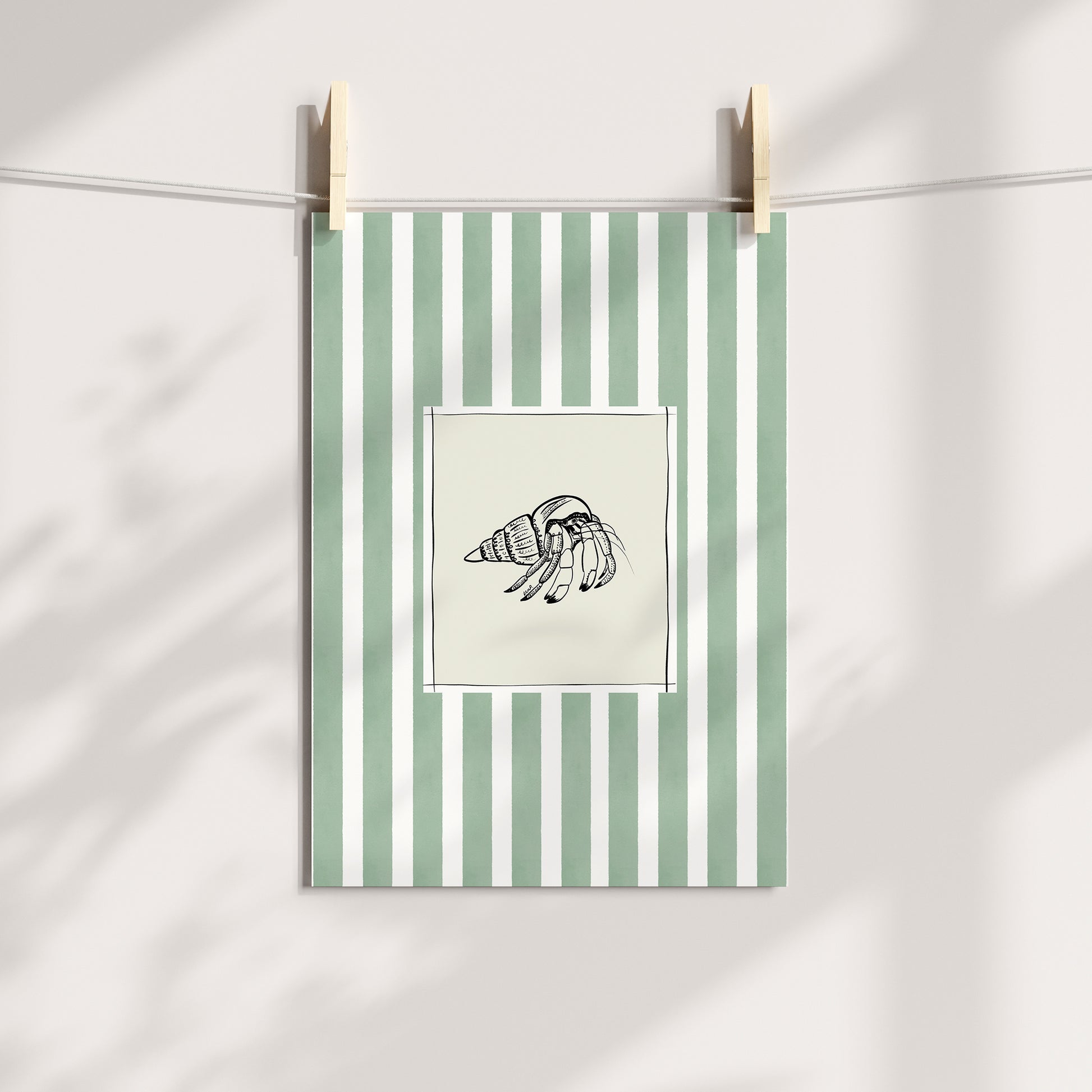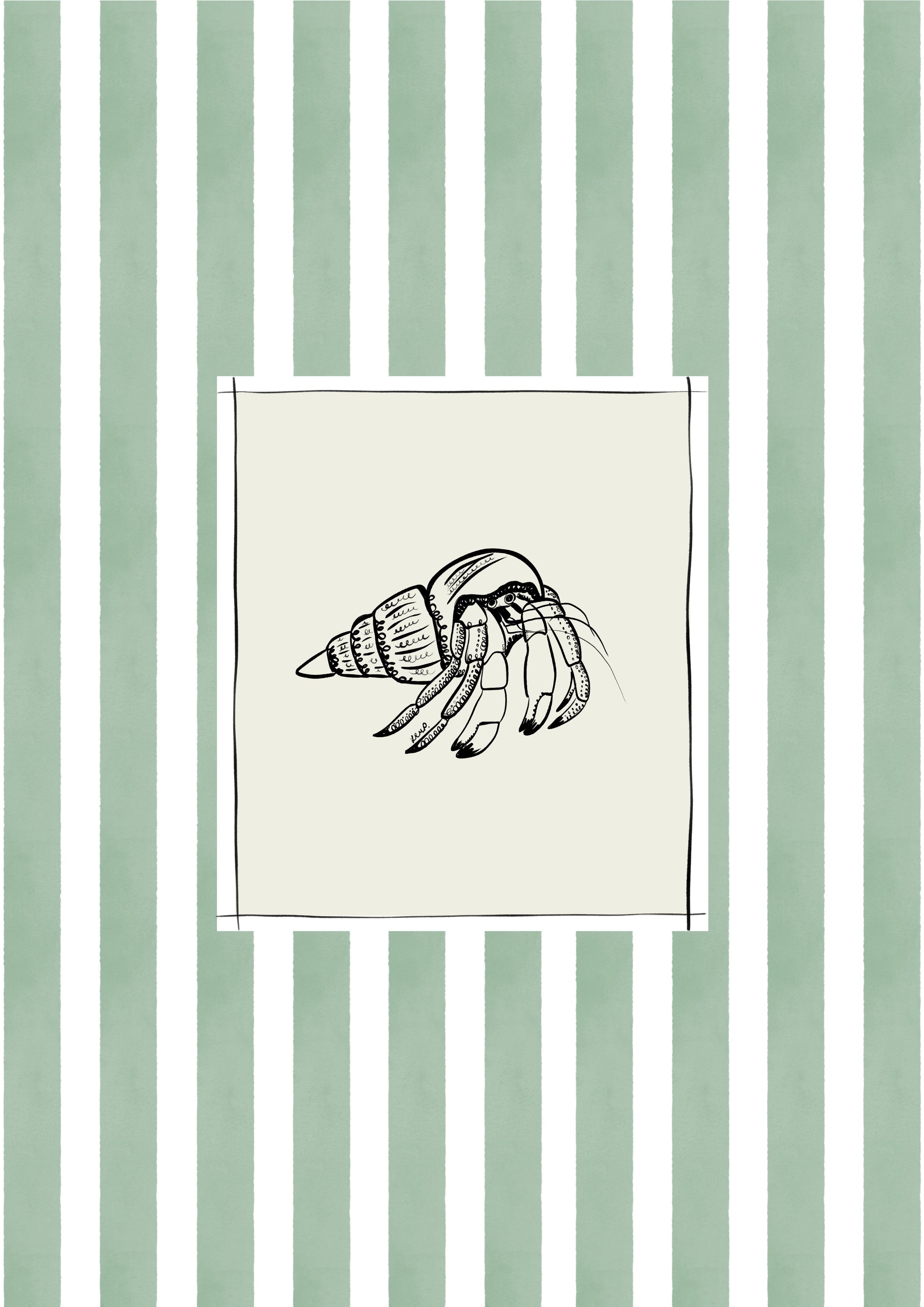 Lovely artful art print of a hermit crab (hand-drawn by me) with a greeny blue watercolour striped surround. An artful birthday gift or for someone moving to a new home, a bedroom, a bathroom - or just any corner needing some colour.