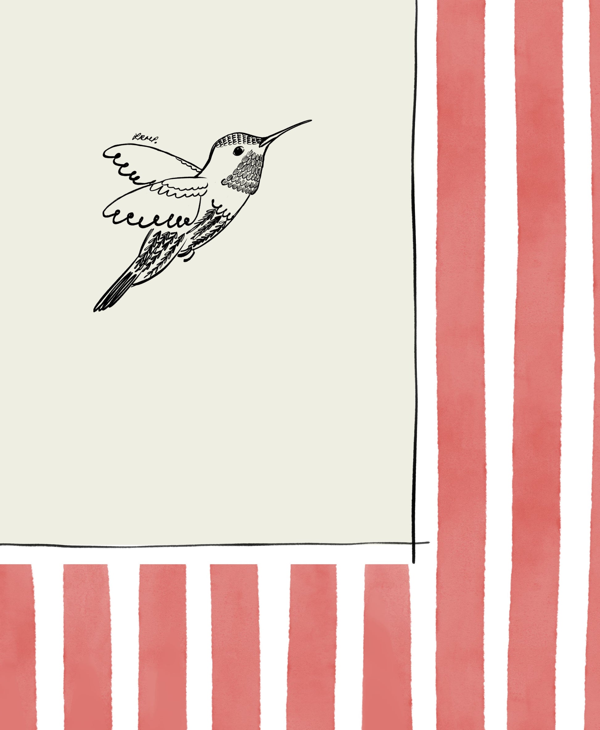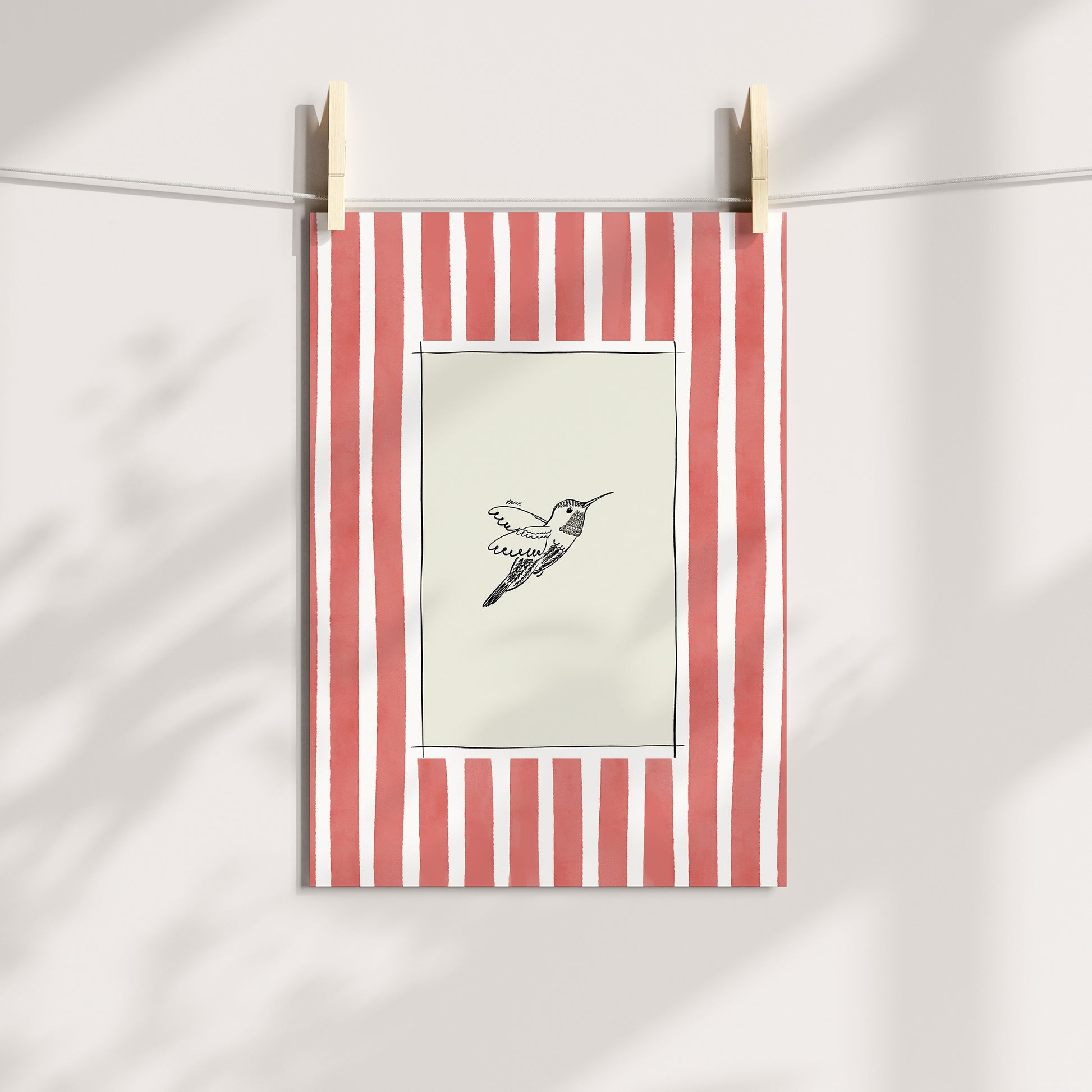 Lovely artful art print of a Hummingbird (hand-drawn by me) with a light red watercolour striped surround. An artful birthday gift or for someone moving to a new home, a bedroom, a bathroom - or just any corner needing some colour.