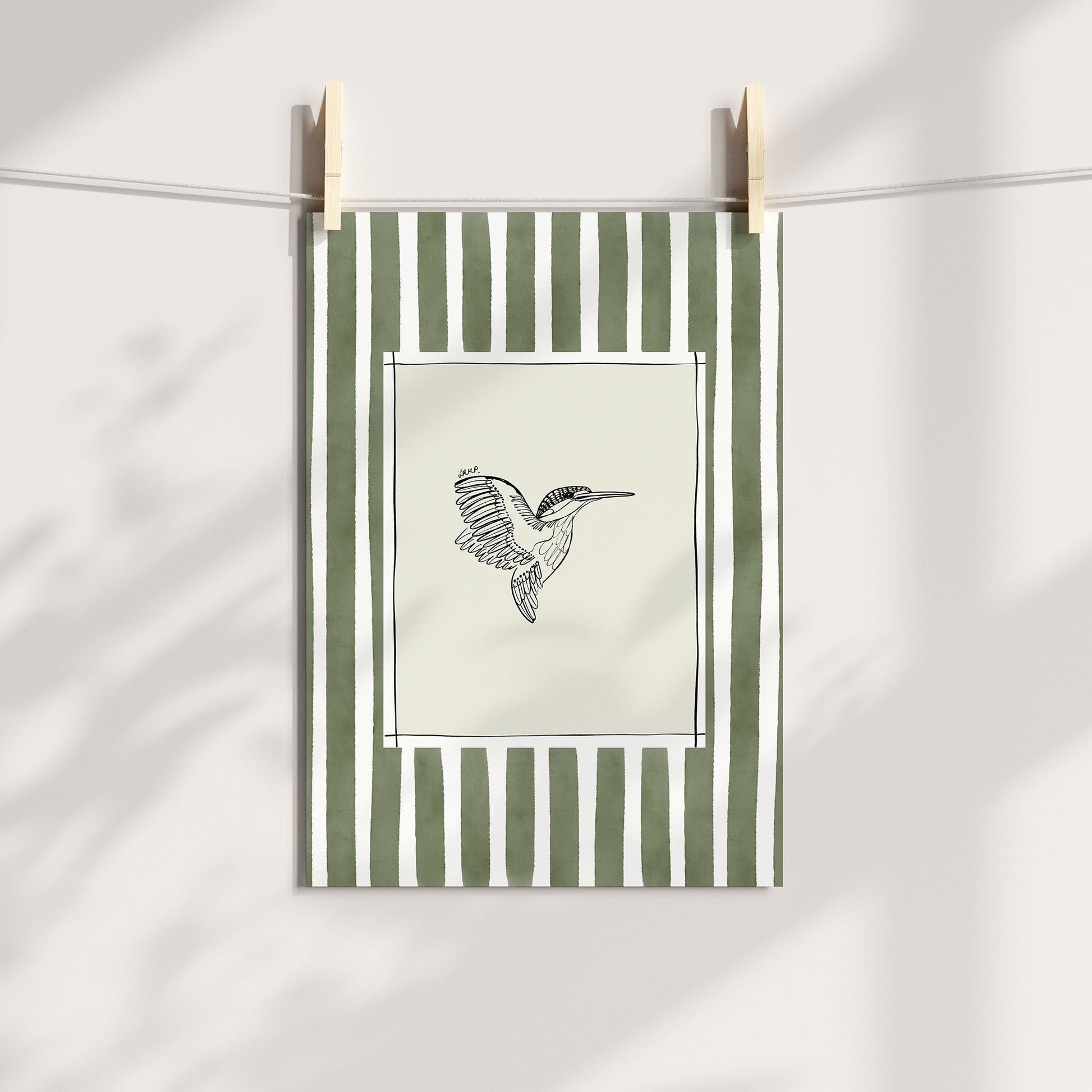 Lovely artful art print of a Kingfisher (hand-drawn by me) with a moss green watercolour striped surround. An artful birthday gift or for someone moving to a new home, a bedroom, a bathroom - or just any corner needing some colour.