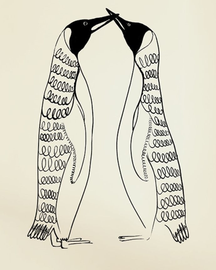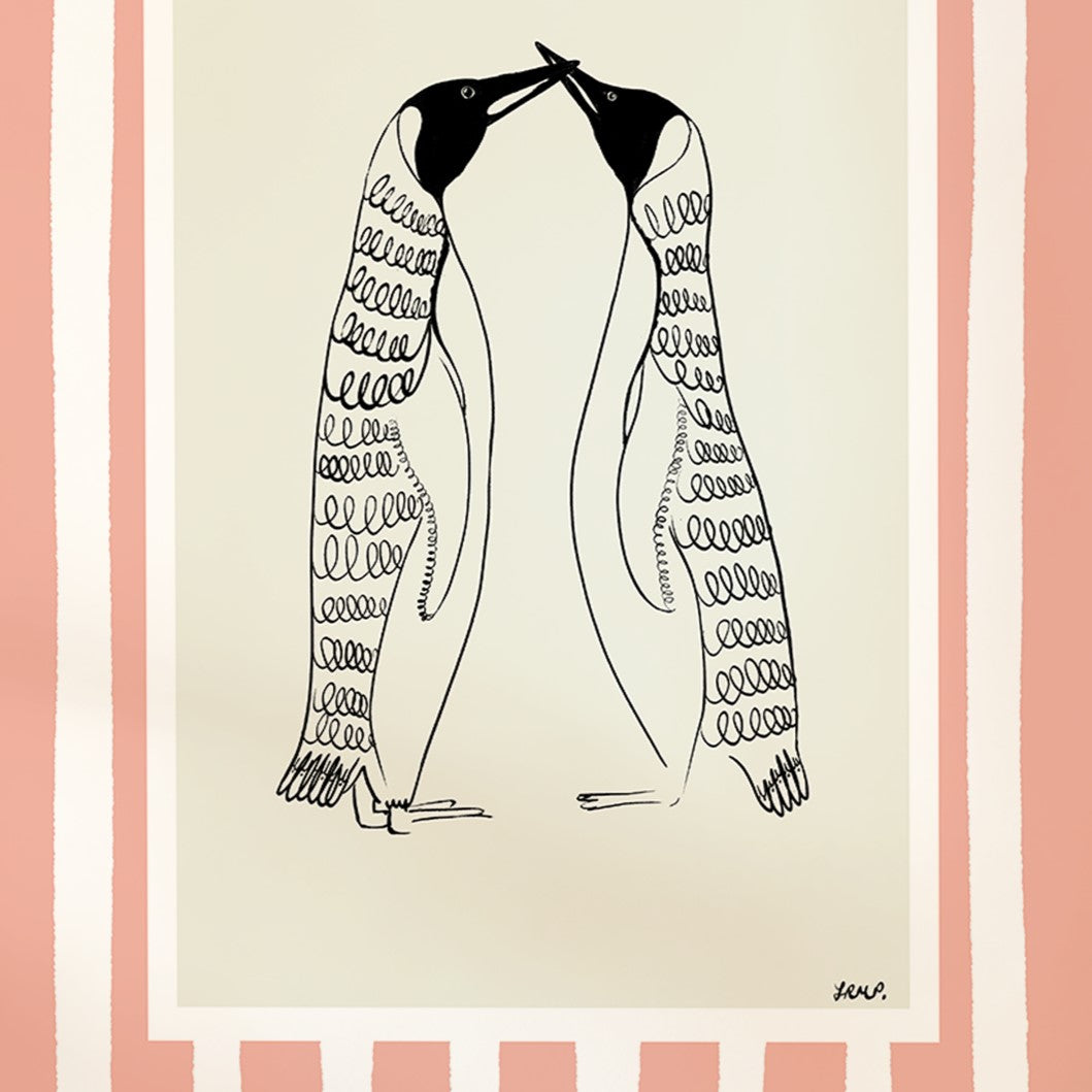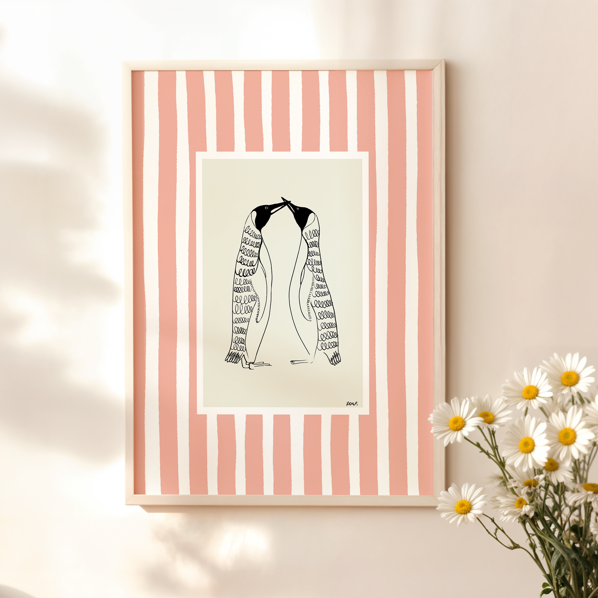 Lovely artful art print of two kissing penguins (hand-drawn by me) with a pink watercolour striped surround. An artful birthday gift or for someone moving to a new home, a bedroom, a bathroom - or just any corner needing some colour.