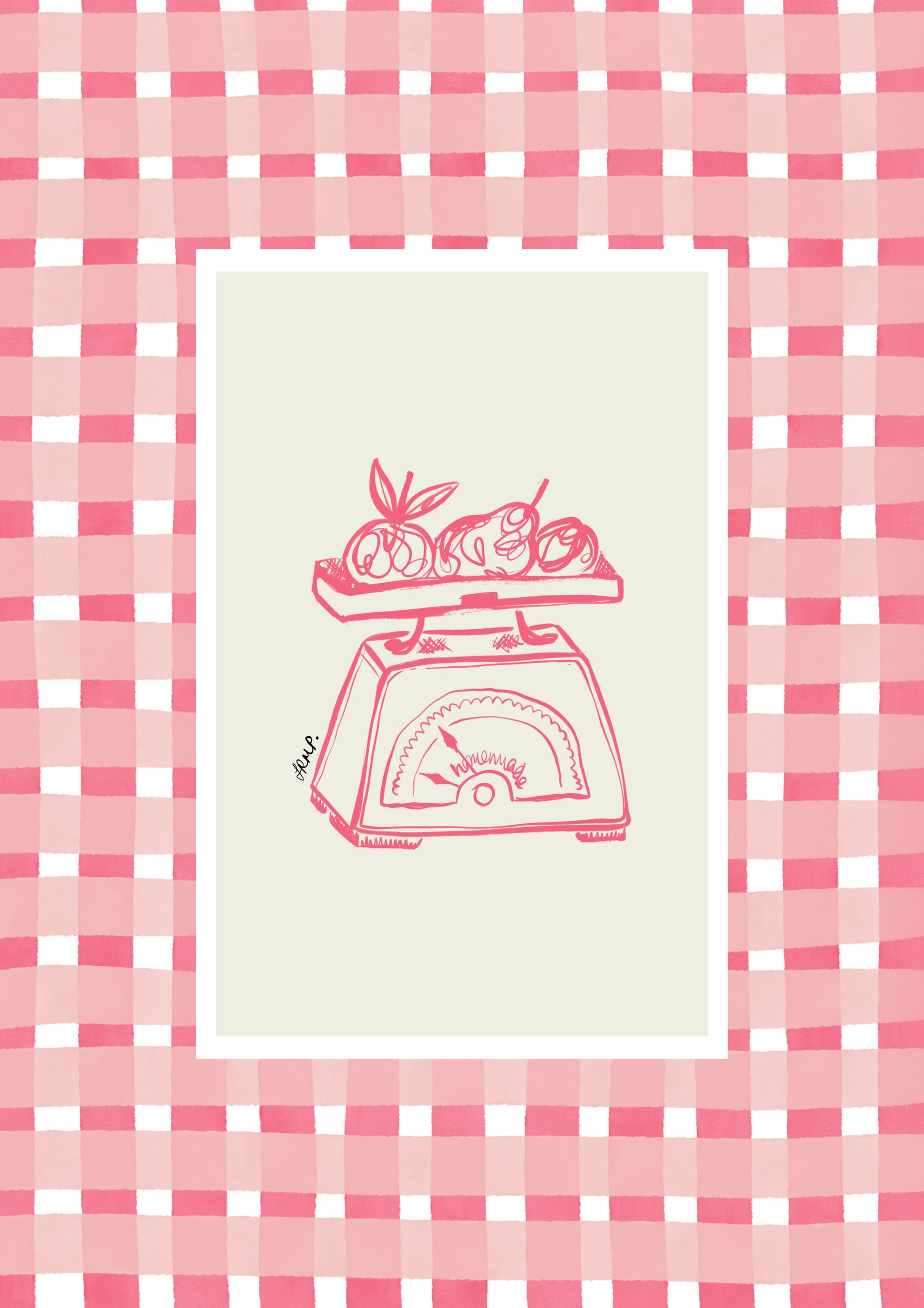 Lovely artful art print of a set of kitchen scales (hand-drawn by me) with a pink watercolour check surround. An artful birthday gift or for someone moving to a new home, a kitchen, utility room - or just any corner needing some colour.