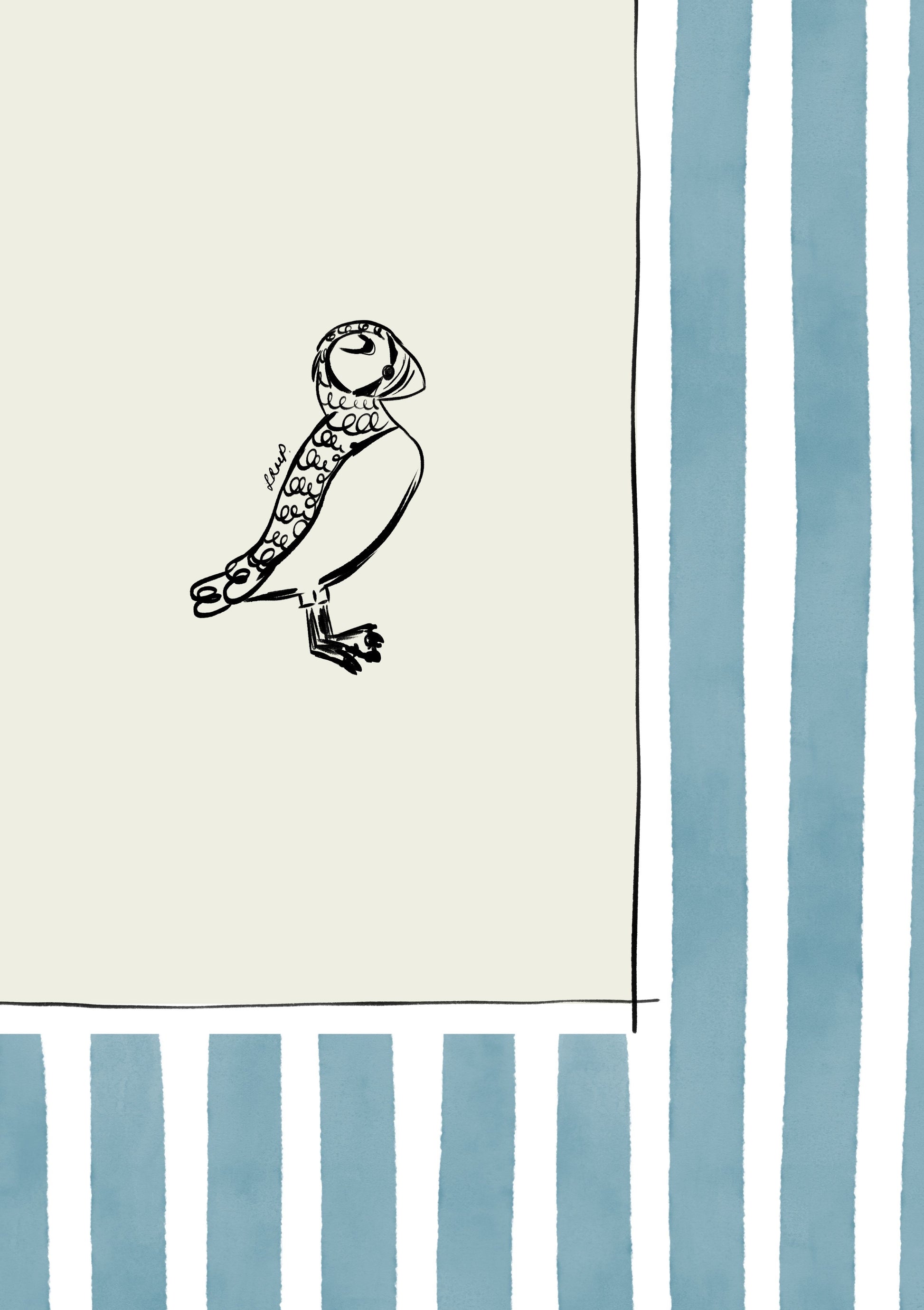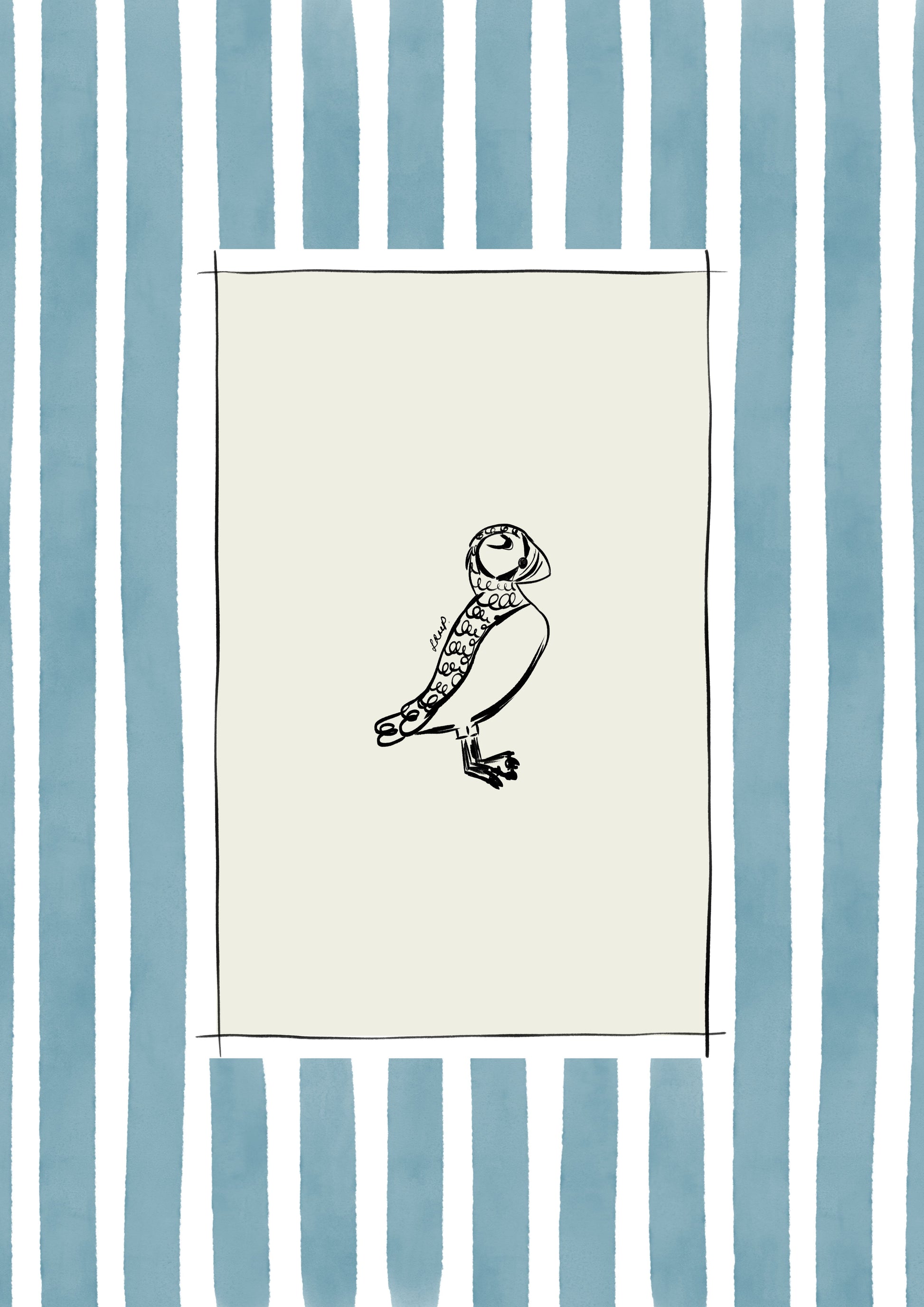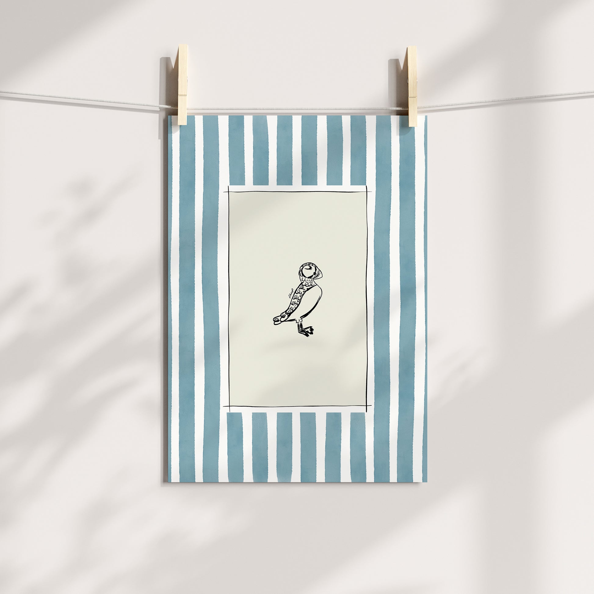 Lovely artful art print of a Puffin (hand-drawn by me) with a blue watercolour striped surround. An artful birthday gift or for someone moving to a new home, a bedroom, a bathroom - or just any corner needing some colour.