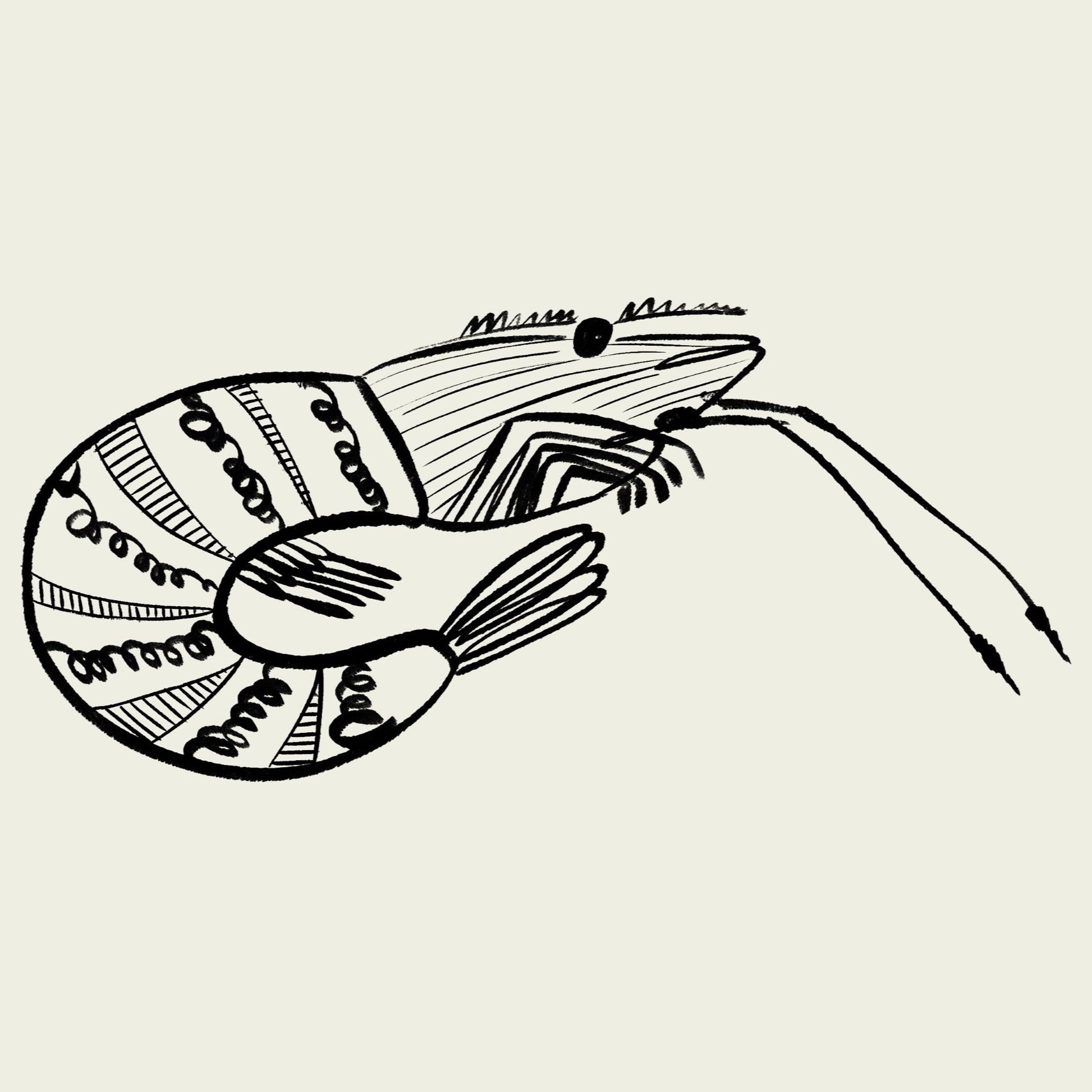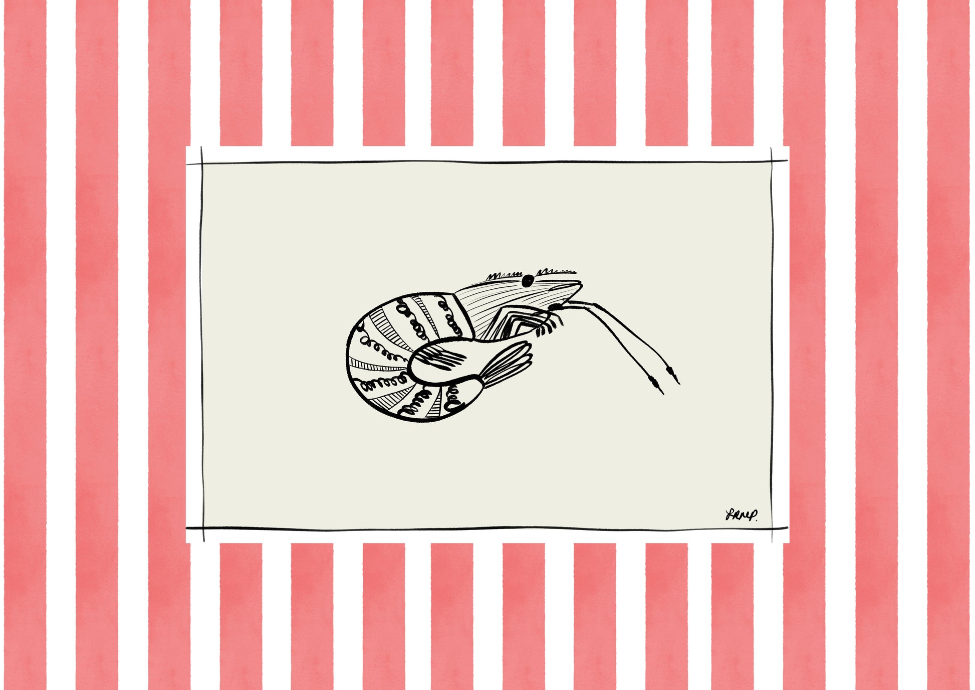 shrimp with pink watercolour striped surround - fish art print by cat dearlove