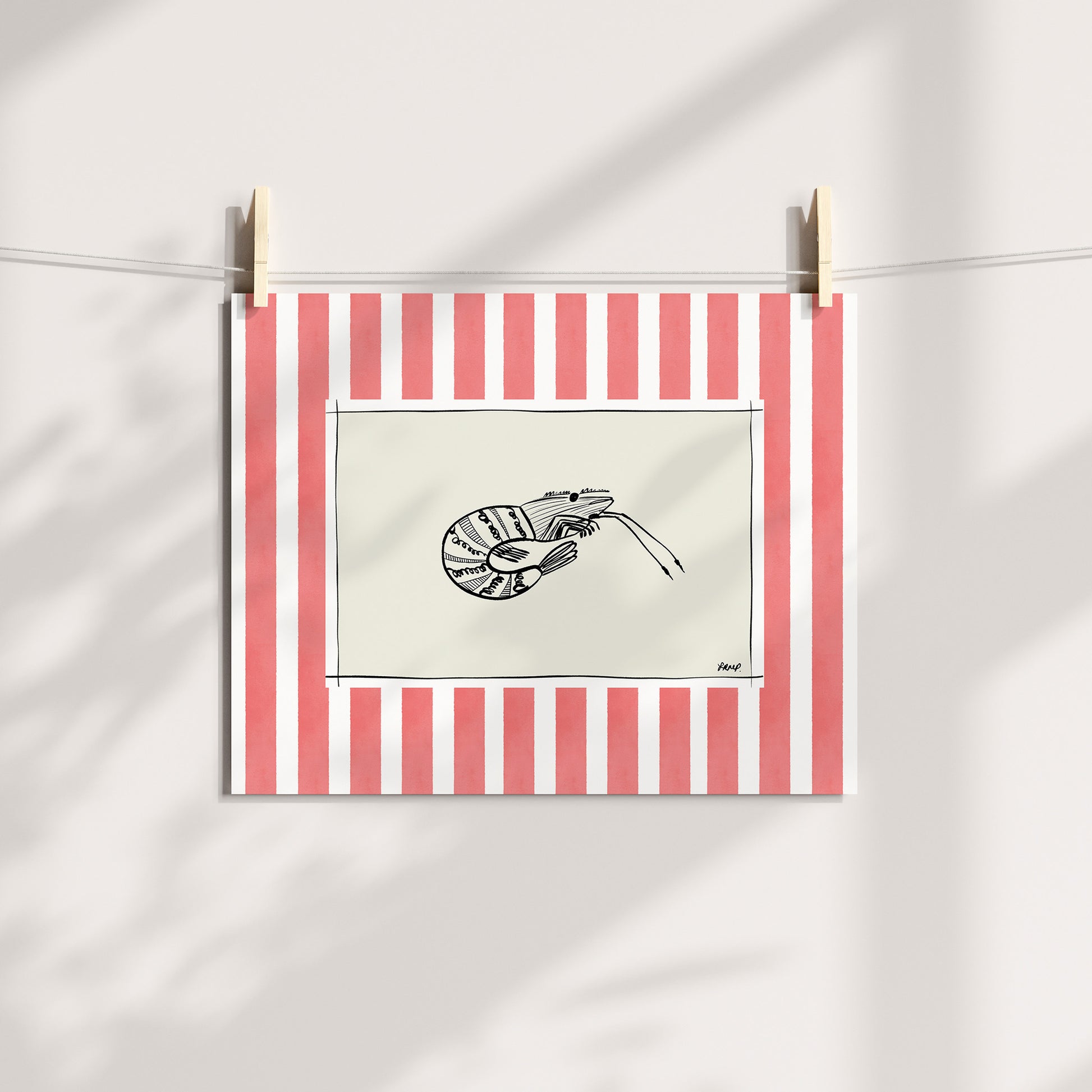 Lovely artful art print of a shrimp (hand-drawn by me) with a pink watercolour striped surround. An artful birthday gift or for someone moving to a new home, a bedroom, a bathroom - or just any corner needing some colour.