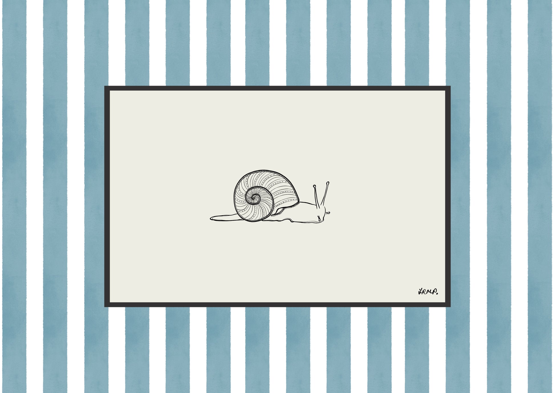 Lovely artful art print of a Snail (hand-drawn by me) with a blue watercolour striped surround. An artful birthday gift or for someone moving to a new home, a bedroom, a bathroom - or just any corner needing some colour.