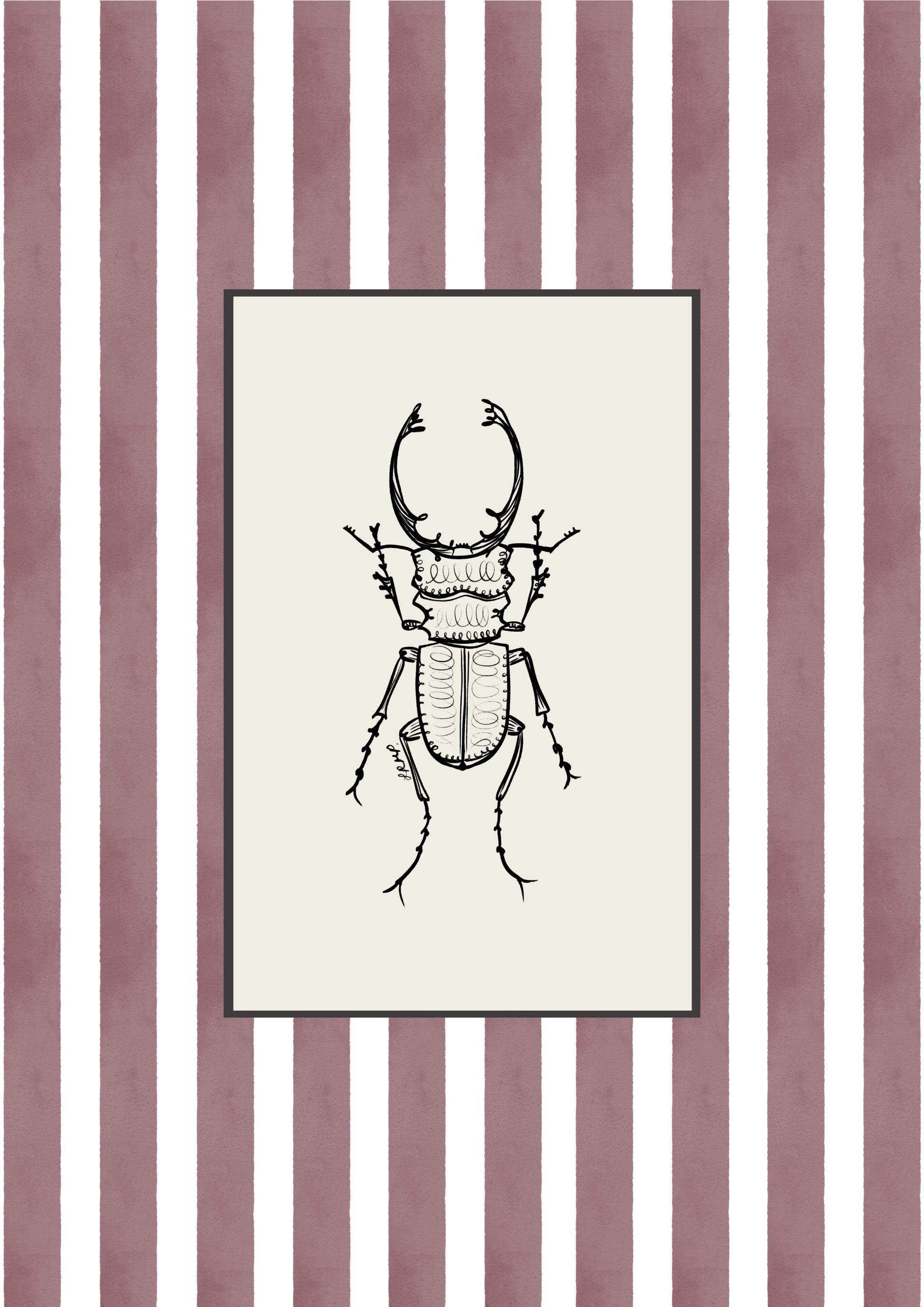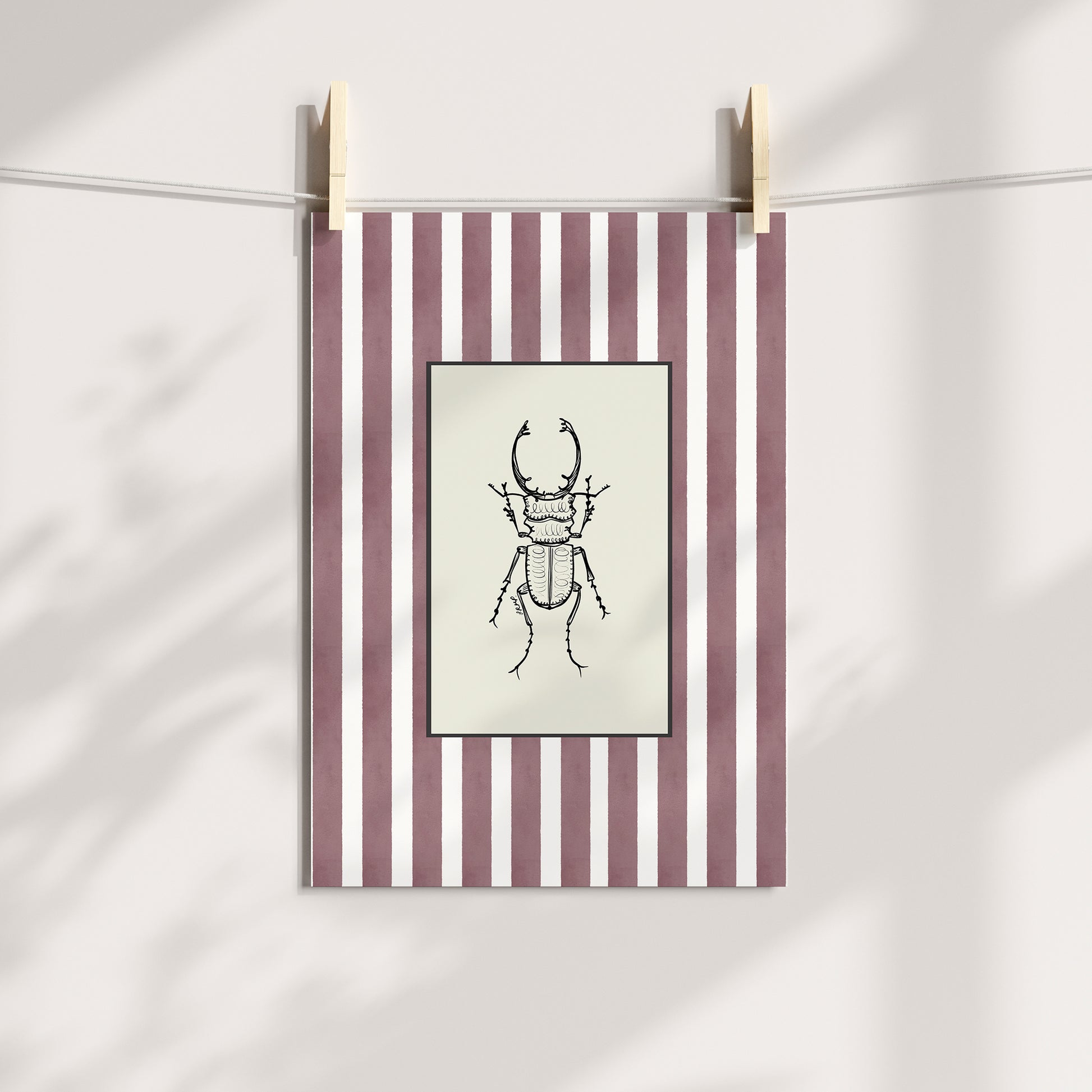 Lovely artful art print of a Stag Beetle (hand-drawn by me) with a purple watercolour striped surround. An artful birthday gift or for someone moving to a new home, a bedroom, a bathroom - or just any corner needing some colour.
