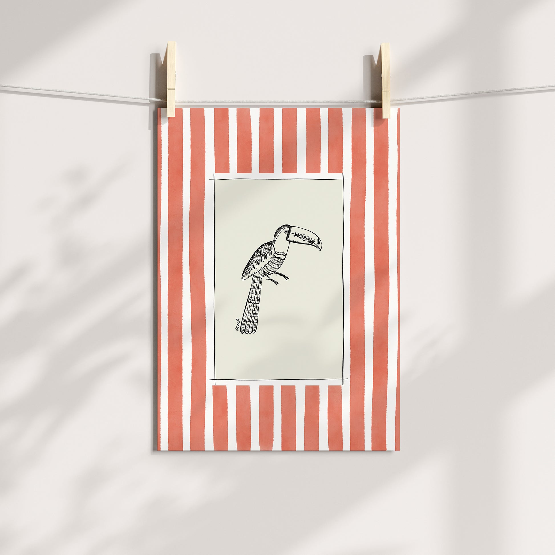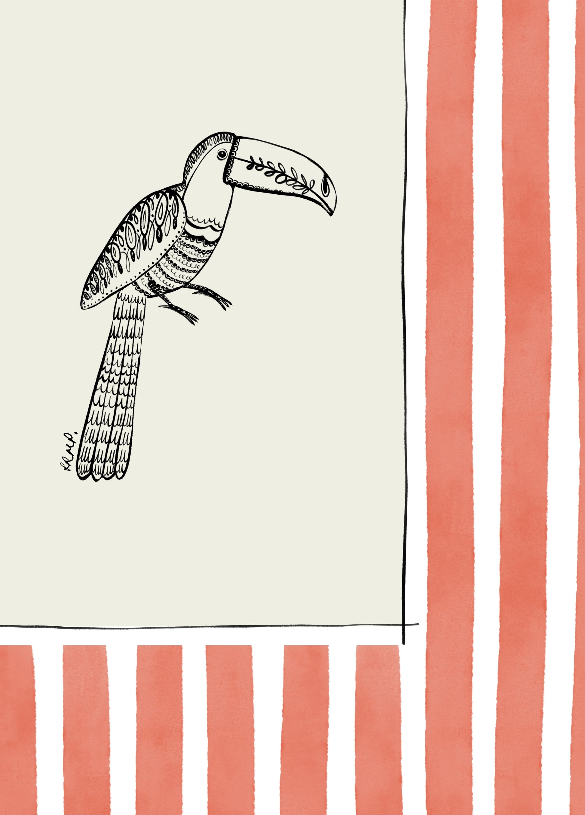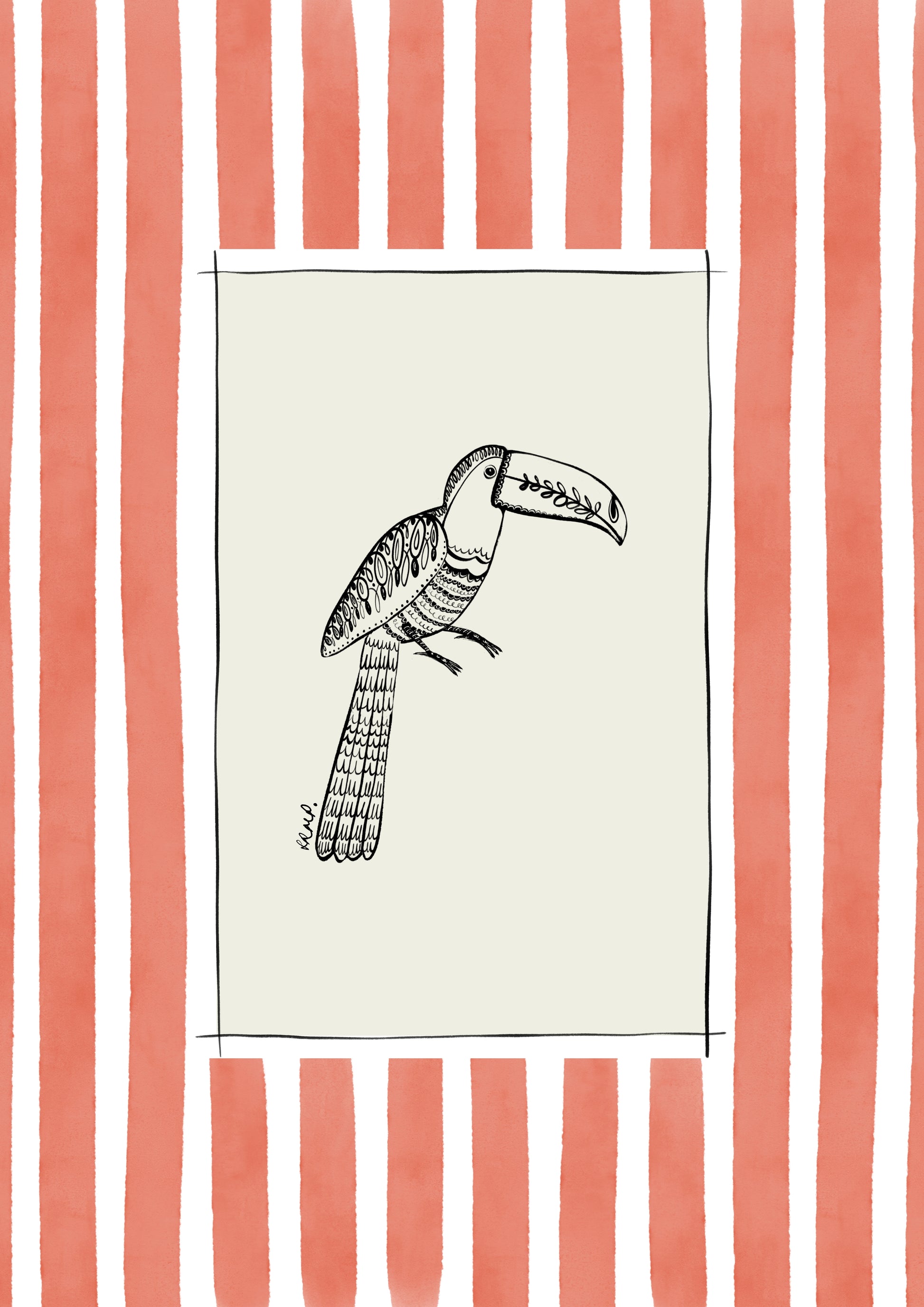 Lovely artful art print of a Toucan (hand-drawn by me) with a coral watercolour striped surround. An artful birthday gift or for someone moving to a new home, a bedroom, a bathroom - or just any corner needing some colour.