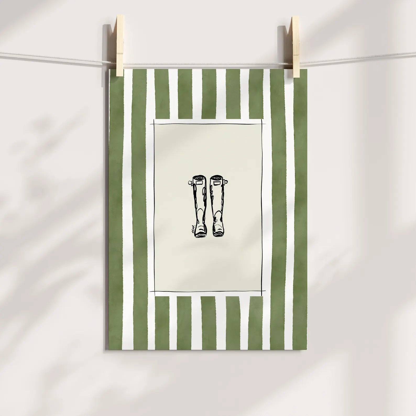 Lovely artful art print of a pair of wellies (hand-drawn by me) with a green watercolour striped surround. An artful birthday gift or for someone moving to a new home, a bedroom, a bathroom - or just any corner needing some colour.